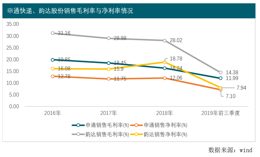 公开资料显示,截至2019年第三季度,申通和韵达的销售总利润率和销售总利润率均有明显下降。 与2018年底的数据相比,申通快递的销售总利润率下降了4.25个百分点,下降了约3成,销售总利润率下降了4.96个百分点,下降了4成以上的韵达股的销售总利润率下降了13.64个百分点,下降了近5成,销售总利润率下降了10.84个百分点,下降了近6成。