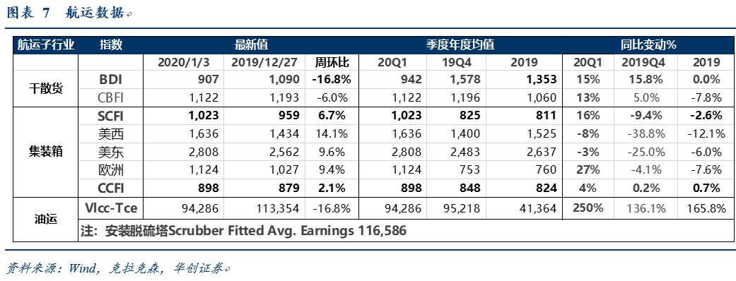 4、航运周数据: VLCC运费报告9.43万美元SCFI连续6周上涨,节日前发货+低硫油条约推动运价上涨。
