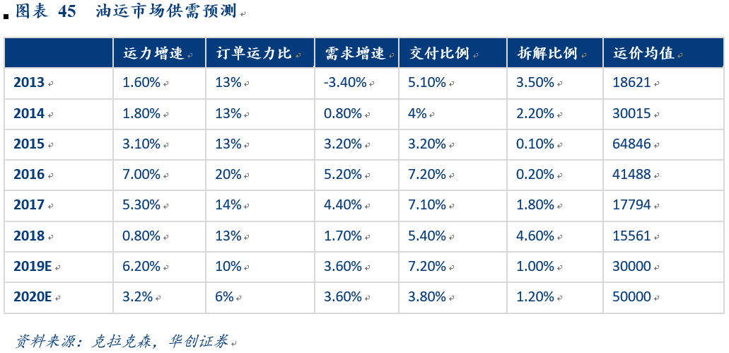 供应:行李订单占当前运力的比例为10.5%,处于历史下位,龙头公司马克斯和海上管理基本无行李订单,预计2020-2021年运力增长率为3.5%、2.1%