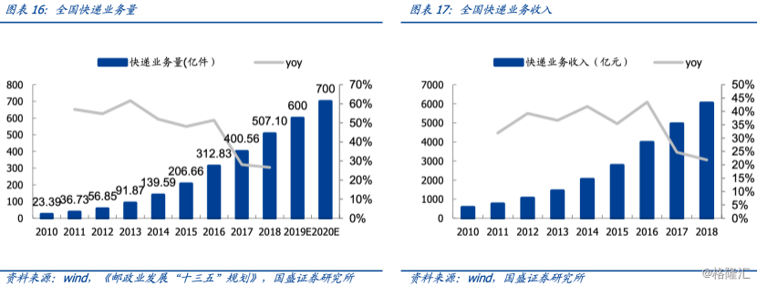 快递业务发展迅速。 国家邮局2019年邮政业务总量达到15000亿元,预计业务收入比上年增长22%,达到9300亿元,比上年增长18%。 其中,快递业务量达到600亿件,比上年增长20%业务收入达到7150亿元,比上年增长19%。 根据“邮政业发展十三五”规划,到2020年中国快递业务量将达到700亿件。
