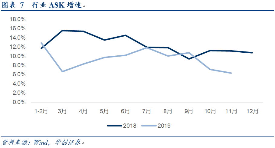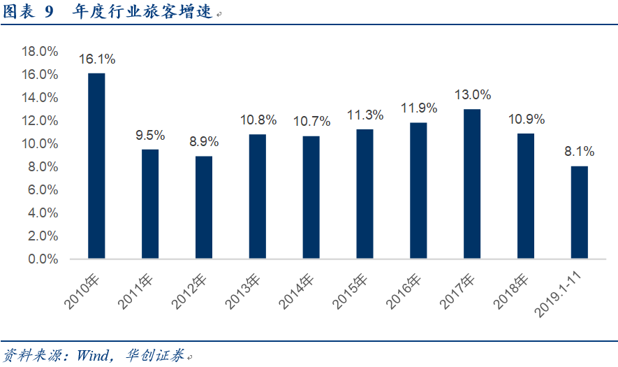 1)2019年特殊因素导致供求减弱: 1月至11月行业旅客数增长8.1%,RPK增长9.6%,ASK增长9.5%。